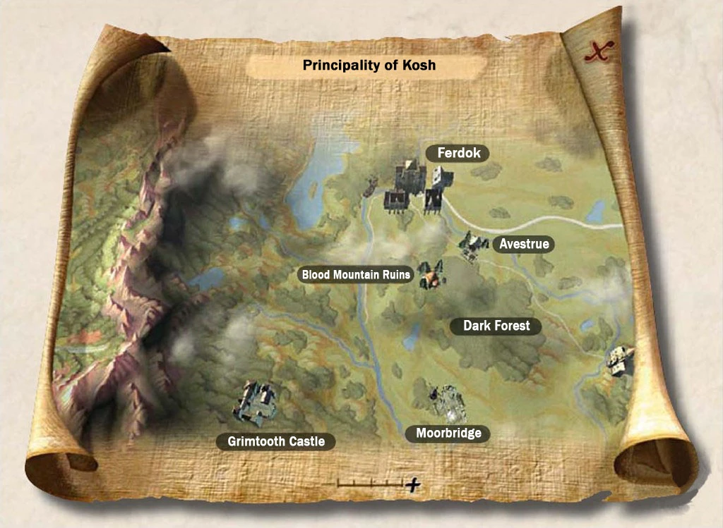 The Principality of Kosh is a peaceful province at the heart of Middlerealm. The Principality is bordered by the mighty Kosh Mountains to the west and the Anvil Mountains to the south. It is home to 80,000 humans and 16,000 Dwarves who have lived here in harmony for time immemorial. The area is known for good craftsmanship and its people love beer, good food and comfortable living. They tend to trust in the traditions and do not interest themselves much in events beyond the borders of their own province. The capital Angbar is governed by Prince Blasius of Boarstock.