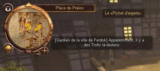 - Après avoir accompli la quête L'Oeil du Dragon, vous apercevez devant la taverne Le Pichet d'argent, Place de Praïos, deux gardiens de la ville qui semblent penser que des trolls se trouvent à l'intérieur.