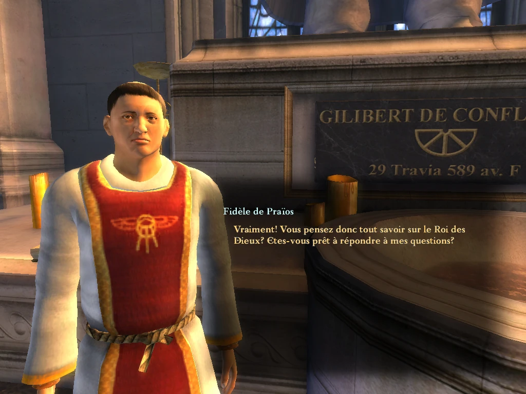 - Entrez au Temple de Praïos, en face de la Résidence d'Ardo, Place de Praïos et engagez la conversation avec le Fidèle de Praïos.