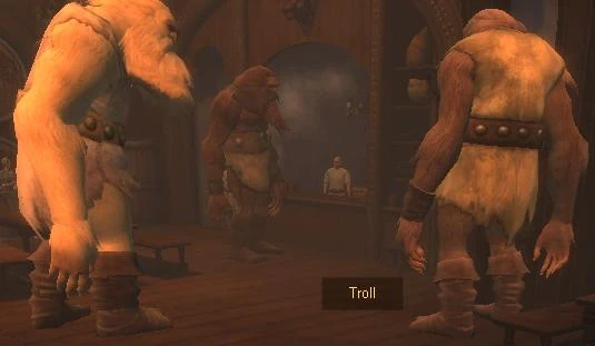 - Entrez pour constater qu'ils ont raison: trois trolls réclament à manger après avoir déjà vidé un tonneau de bière. Tradan Brewmore est désespéré et vous demande de l'aider à les faire partir. Il vous promet 2 Ducats en récompense, que vous pouvez tout de suite négocier (PT>3) à 6 Ducats en lui reparlant (vous y gagnez de plus les +05 points d'aventure pour l'utilisation du talent).