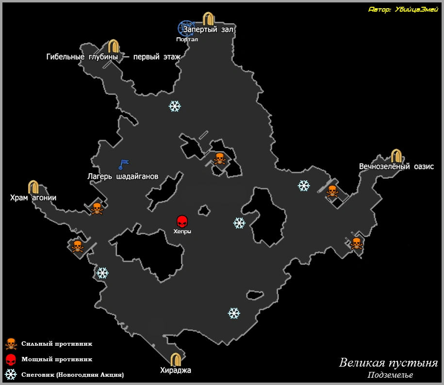 С выходом патча 261_21 на дату 30.10.2025 великую пустыню сделали обычным подземельем, которая и являлась как таковым обычным подземельем с названием "Великая пустыня - подземелье". Была она особенной, своеобразной. Не совсем и тем и этим.. Но где-то между тем и этим.. Особенности были в том, что монстры возрождались через определенное время на своих точках расположения как в общественных локациях. Страж Хепри так-же возрождался через определенное время, с которого можно было добыть