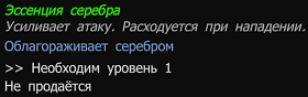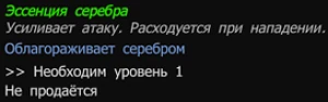 Облагораживает оружие серебром. Эссенция действует против волков и оборотней во время акции Полнолуние. |